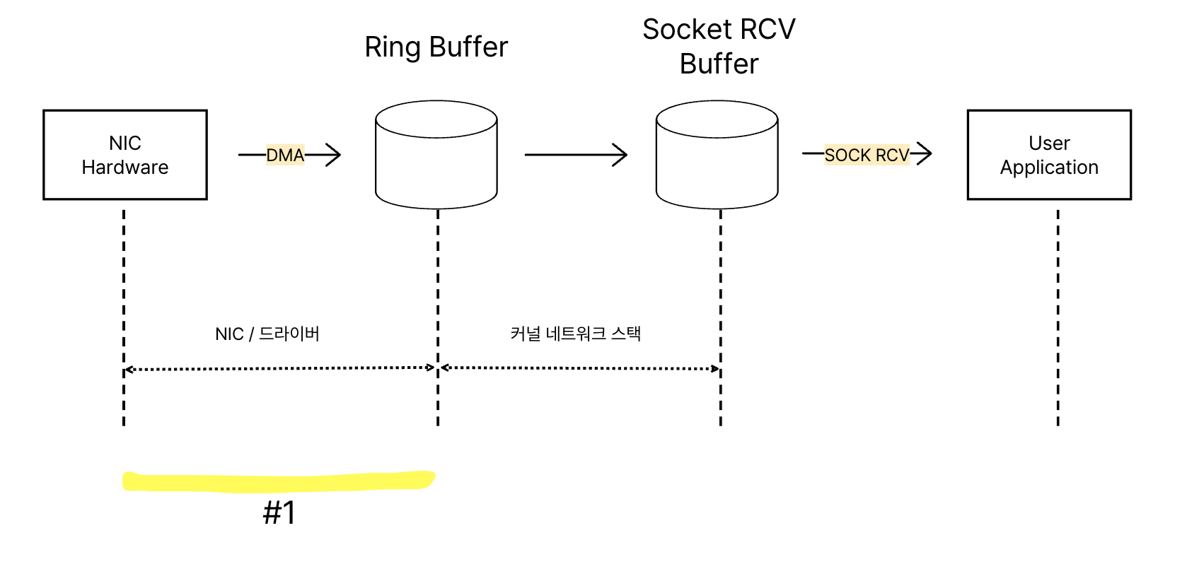 위 그림은 패킷이 NIC에서 애플리케이션까지 도달하는 전체 여정을 추상화한 것입니다. 이번 글에서는 첫 번째 관문, NIC에서 커널 메모리의 링 버퍼(Ring Buffer)까지 데이터가 이동하는 과정에 대해 자세히 살펴보겠습니다.