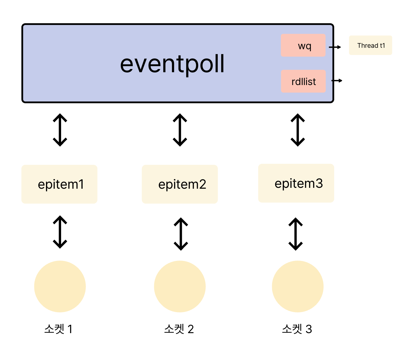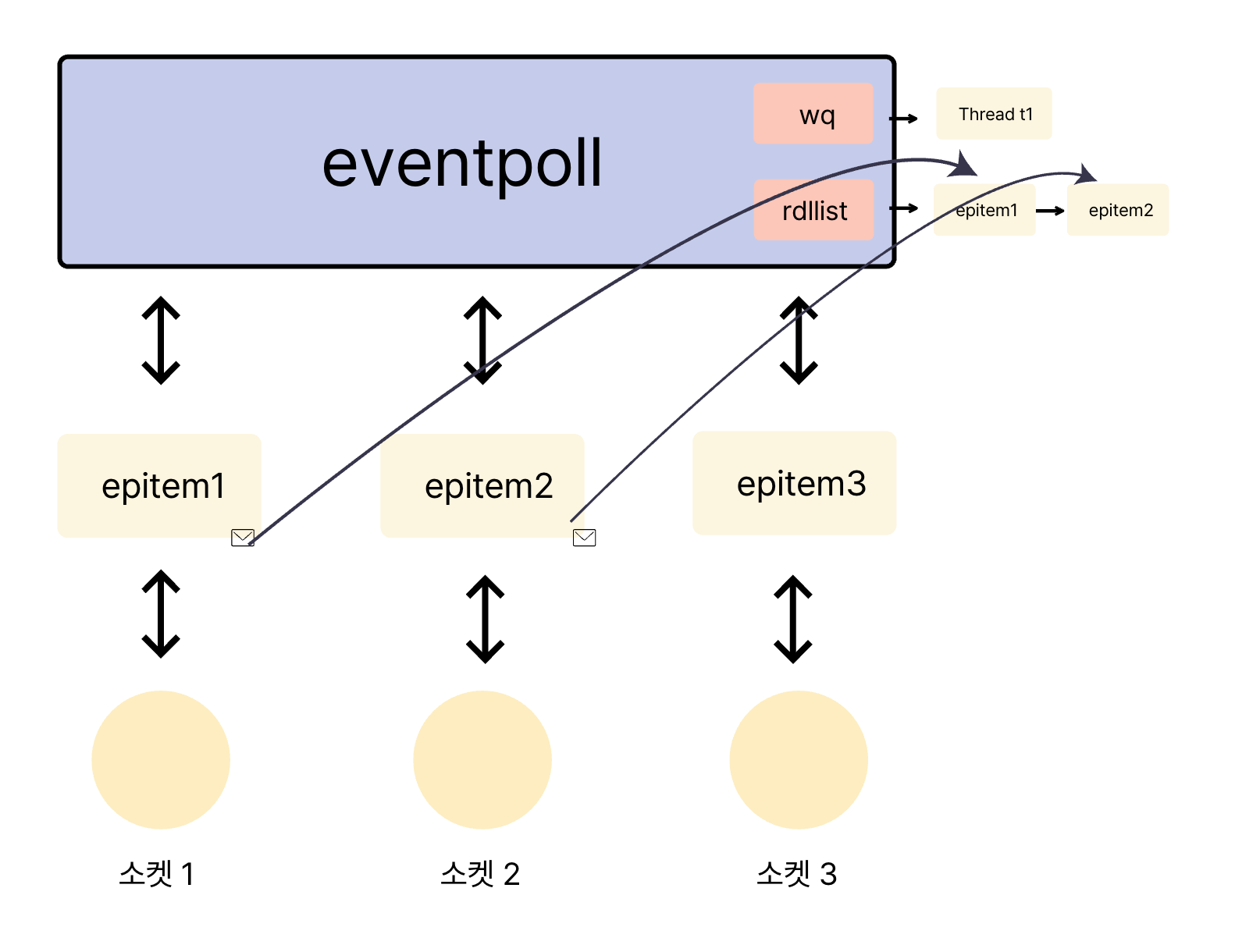 이 구조를 통해 eventpoll 인스턴스가 하는 일을 간략히 정의할 수 있습니다. 평소에는 wq 대기 큐에 연결된 스레드와 함께 대기 상태에 있다가, rdllist에 새로운 이벤트(epitem)가 등록되면, wq에서 잠자던 스레드를 깨워 rdllist의 내용을 사용자 공간으로 전달하는 역할을 합니다.