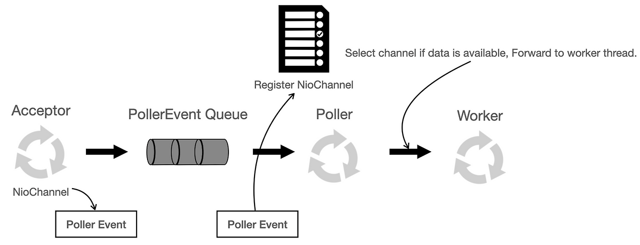 위 코드에서 보듯이 Acceptor는 루프 내에서 endpoint.serverSocketAccept()를 호출하여 블로킹 상태로 새로운 연결을 기다립니다. 연결이 들어오면 endpoint.setSocketOptions(socket) 메서드를 호출하여 소켓을 초기화하고 Poller에게 등록을 위임합니다.