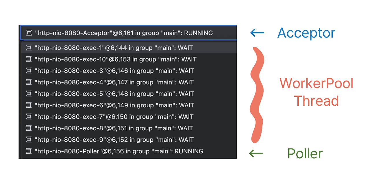 실제로 스프링 부트 애플리케이션을 기본 설정으로 실행한 후 디버깅 모드에서 스레드 목록을 살펴보면, 위 이미지와 같이 http-nio-8080-Acceptor, http-nio-8080-Poller, 그리고 다수의 http-nio-8080-exec-* (Worker 스레드) 형태의 스레드들을 확인할 수 있습니다.