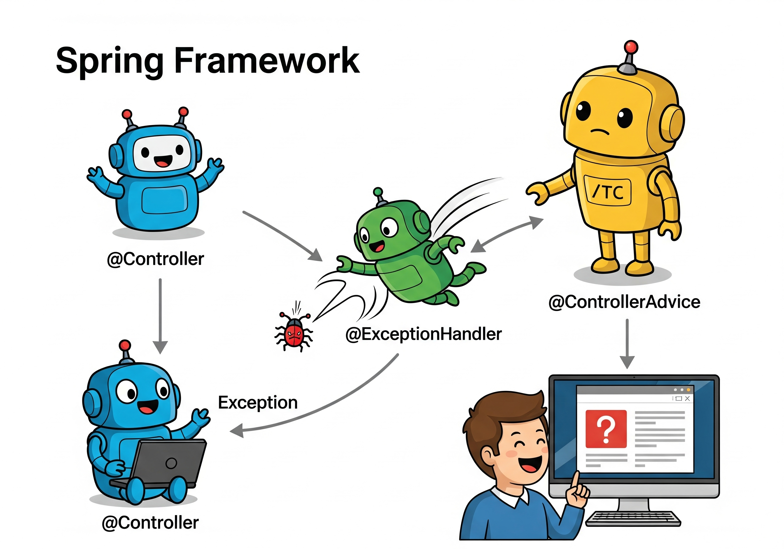 Spring Framework의 소스 코드를 직접 따라가며, 예외 하나가 어떤 여정을 거쳐 처리되는지 함께 알아보도록 하겠습니다. 이 글을 다 읽고 나면, 여러분의 예외 처리 코드가 단순한 '마법'이 아니라, 잘 설계된 메커니즘 위에서 동작하고 있다는 사실을 깨닫게 될 겁니다.