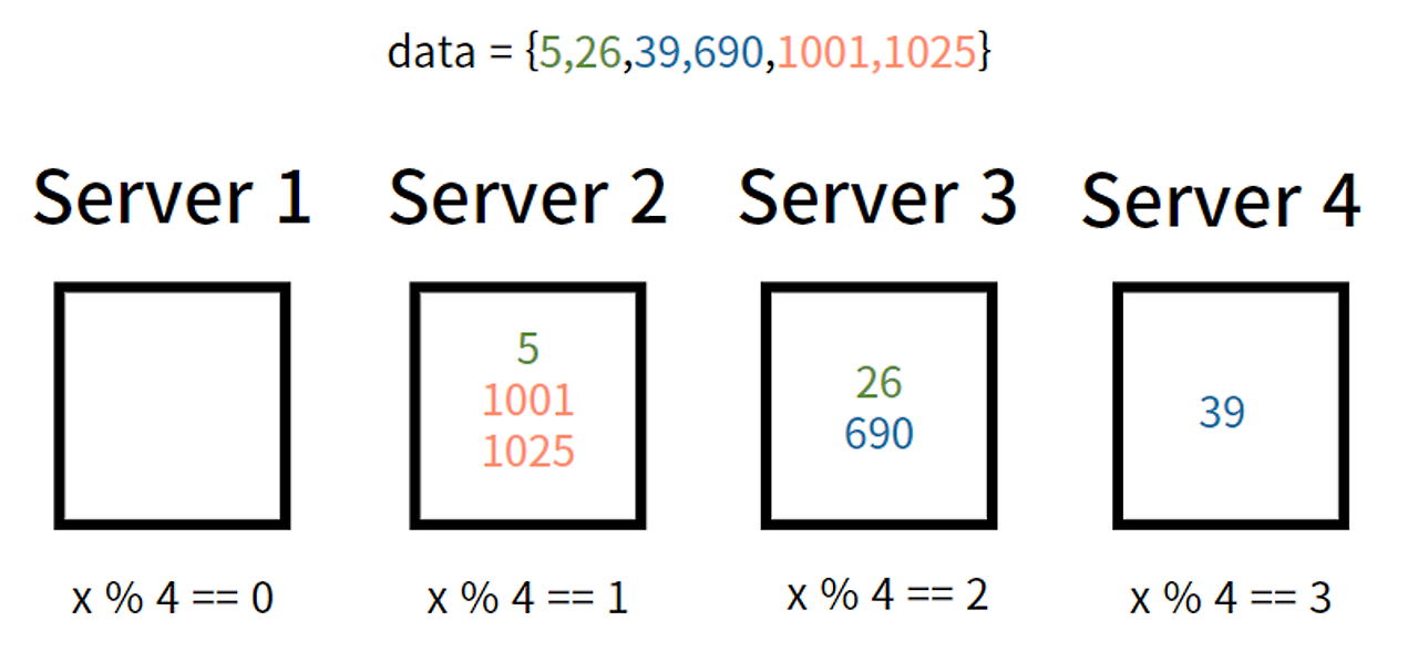 지금은 데이터가 6개 밖에 없지만 실업무 환경에서는 많을경우 수억개의 데이터들이 저장될텐데, 만약 db 서버 한개를 추가할때마다 그 모든 데이터들이 재배치되게 된다면 큰 문제가 발생할 것이다.